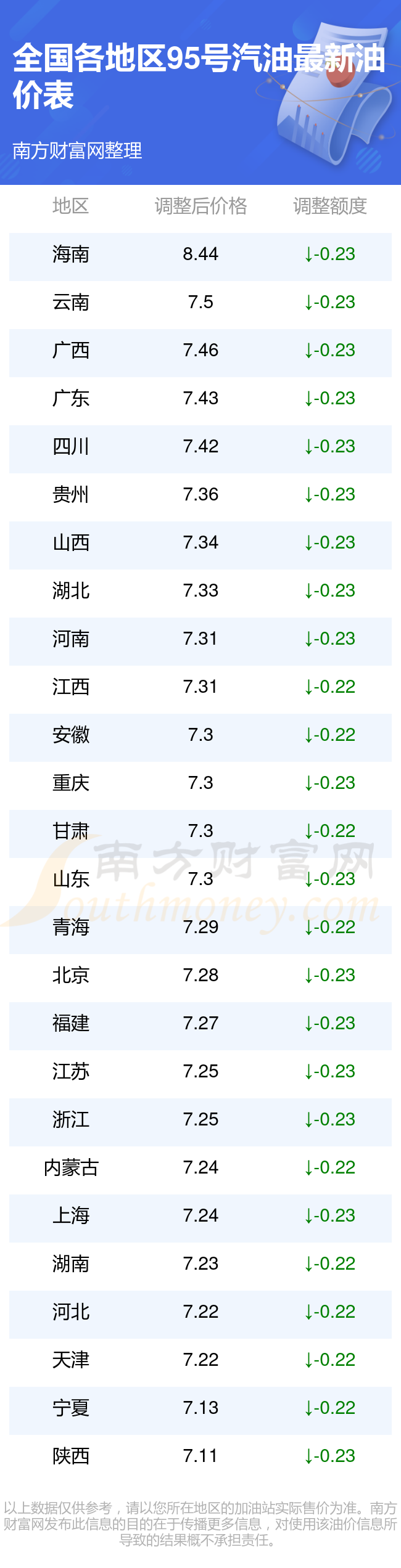 全国95号汽油10月30日最新平均价格为7元/升,调整时间为10月28日。其中,全国95号汽油最低为陕西,价格为7.11元/升;95号汽油最高为海南,价格为8.44元/升。
