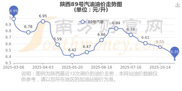 10月30日,陕西89号汽油的价格是6.35元每升,本次的调整时间为10月28日,对比上次的调整减了0.2元,减3.053%,下次调整时间为11月10日24时,还有11.96天。